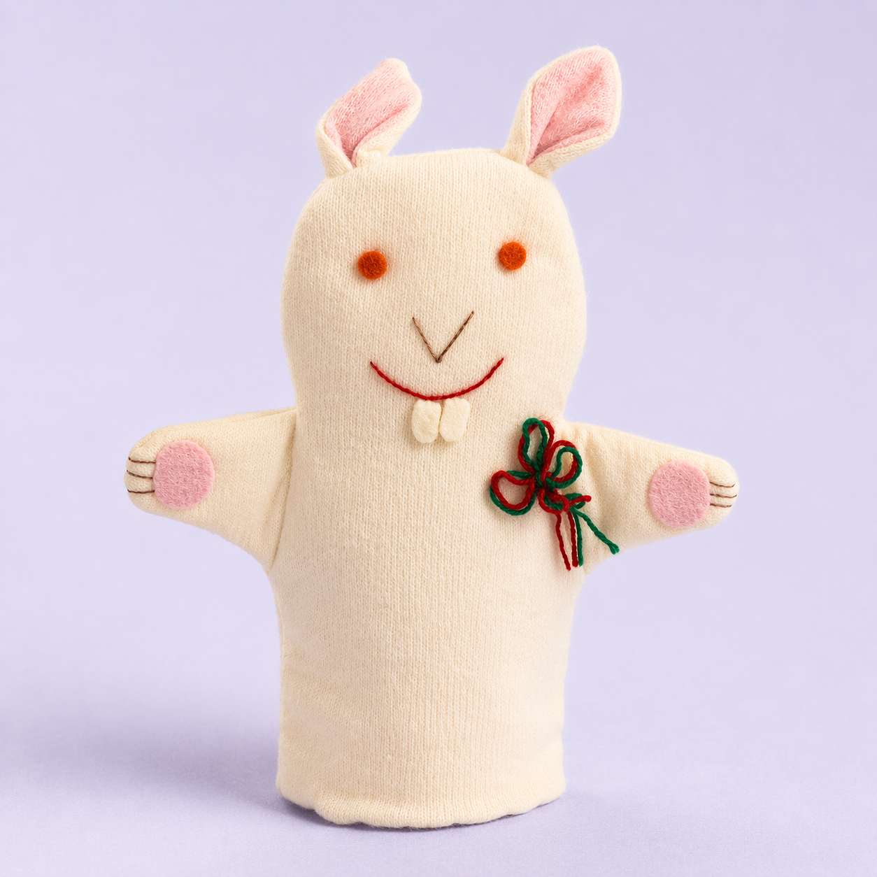 The head and hands of a hand puppet can be made of materials that are either solid (wood, plastic wood, papier mâché) or pliable (fabric, foam rubber, latex). Hand puppets usually have no legs; when they do have legs, these hang limply without being controlled. However, this hand puppet is made out of cotton.