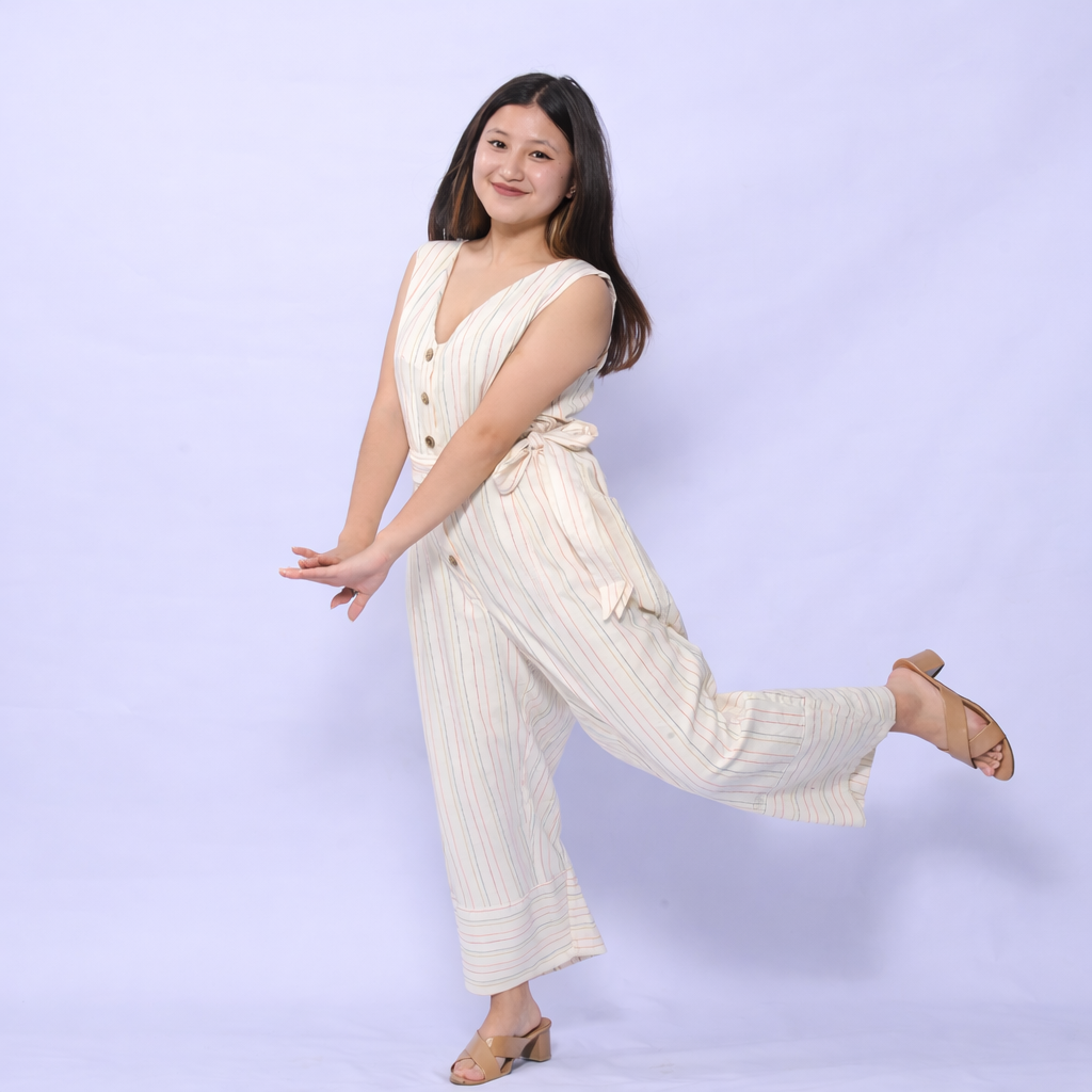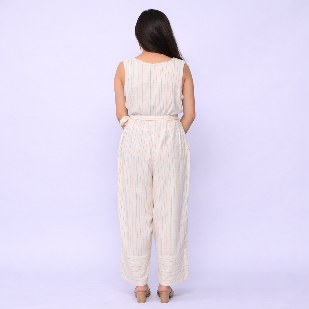 This striped handwoven jumpsuit features subtle vertical stripe patterns that create a clean, modern aesthetic while maintaining its handcrafted identity. The structured silhouette is enhanced with a button-front detail and an adjustable waist tie, allowing a comfortable and flattering fit. Its sleeveless design and relaxed cut ensure ease of movement, making it suitable for casual outings, travel, or relaxed gatherings.